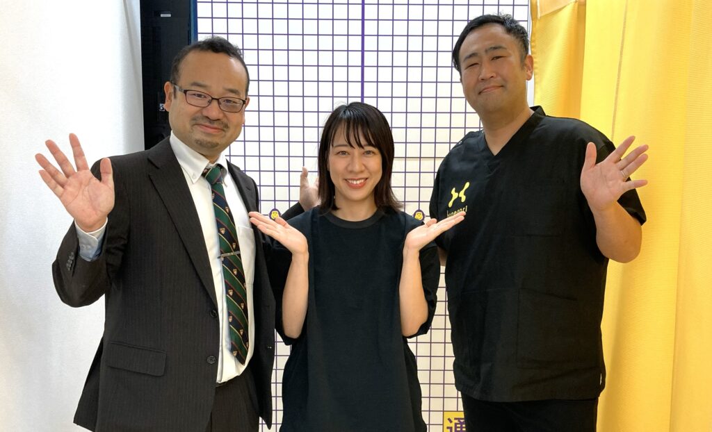 左から株式会社ほねごり代表阿部公太郎、フリーアナウンサー長澤彩子さん、鍼灸師スズえもん