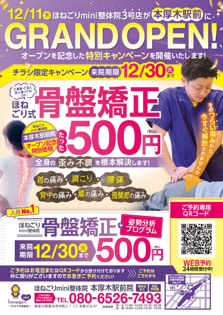 身体の不調は我慢せず、ぜひこのお得な機会に「ほねごりmini整体院 本厚木駅前院」へお越しください。