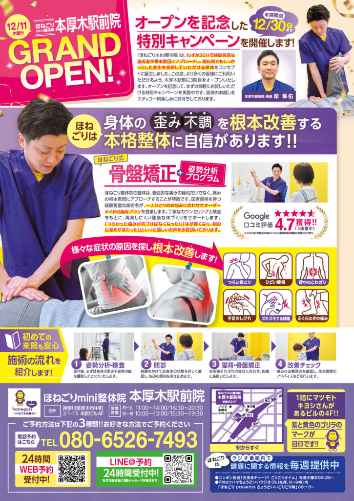 2025年12月11日(木)、小田急線「本厚木駅」北口から降りてすぐのアクセス抜群の立地に、ほねごりmini整体院の3院目となる「ほねごりmini整体院 本厚木駅前院」が新しくオープンいたします。