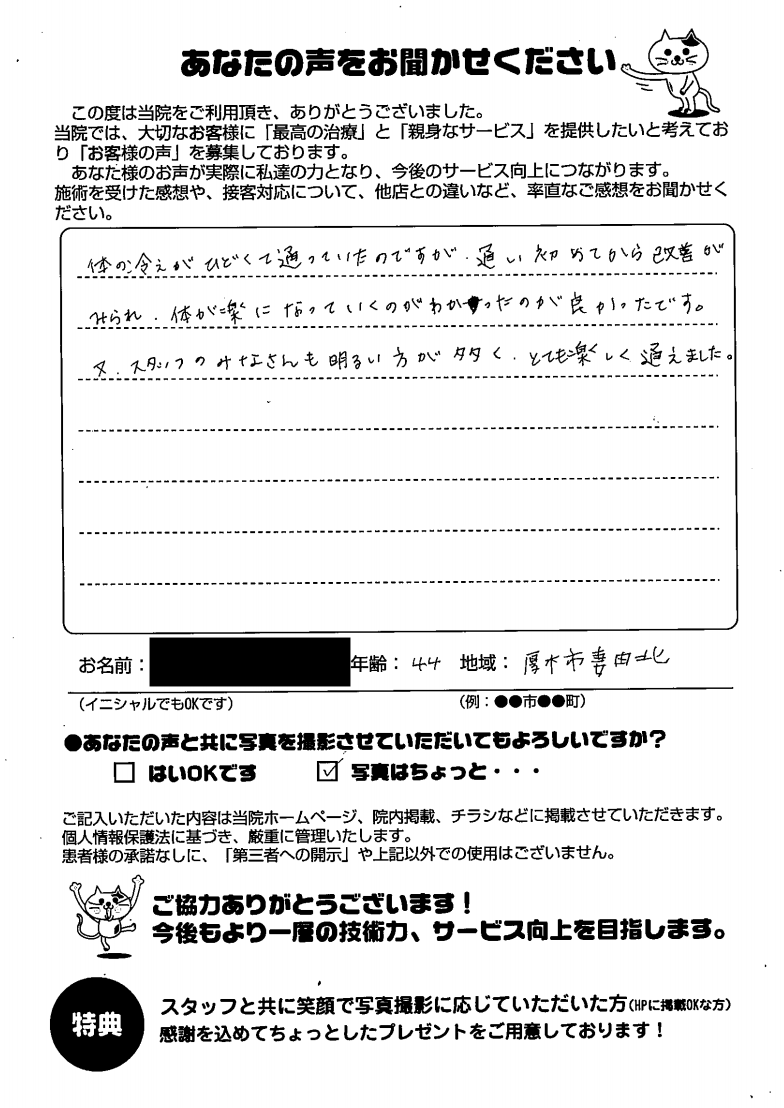 体の冷えがひどくて通っていたのですが、通い始めてから改善がみられ、身体が楽になっていくのが分かったのが良かったです。