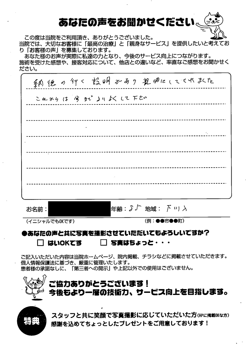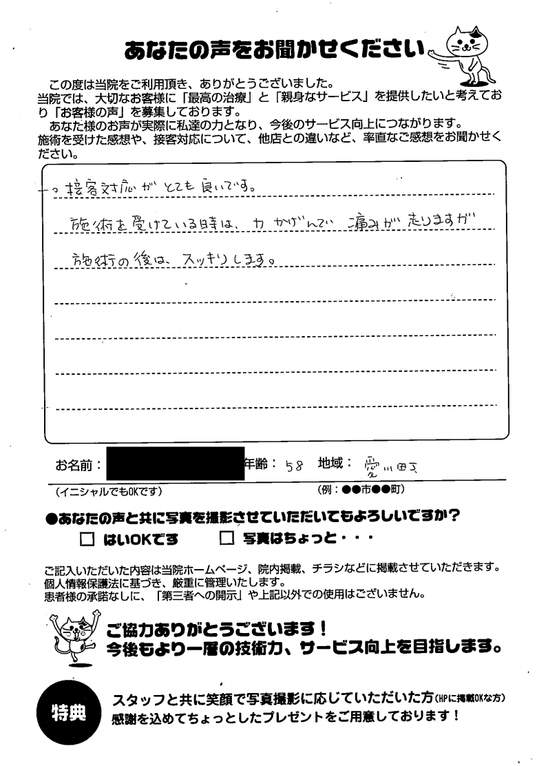 先生方が私の体の状態をよく知ってくださっているので、来た時にここが痛いというとすぐやってくださるので、それがいいなと思い、通い続けています。
