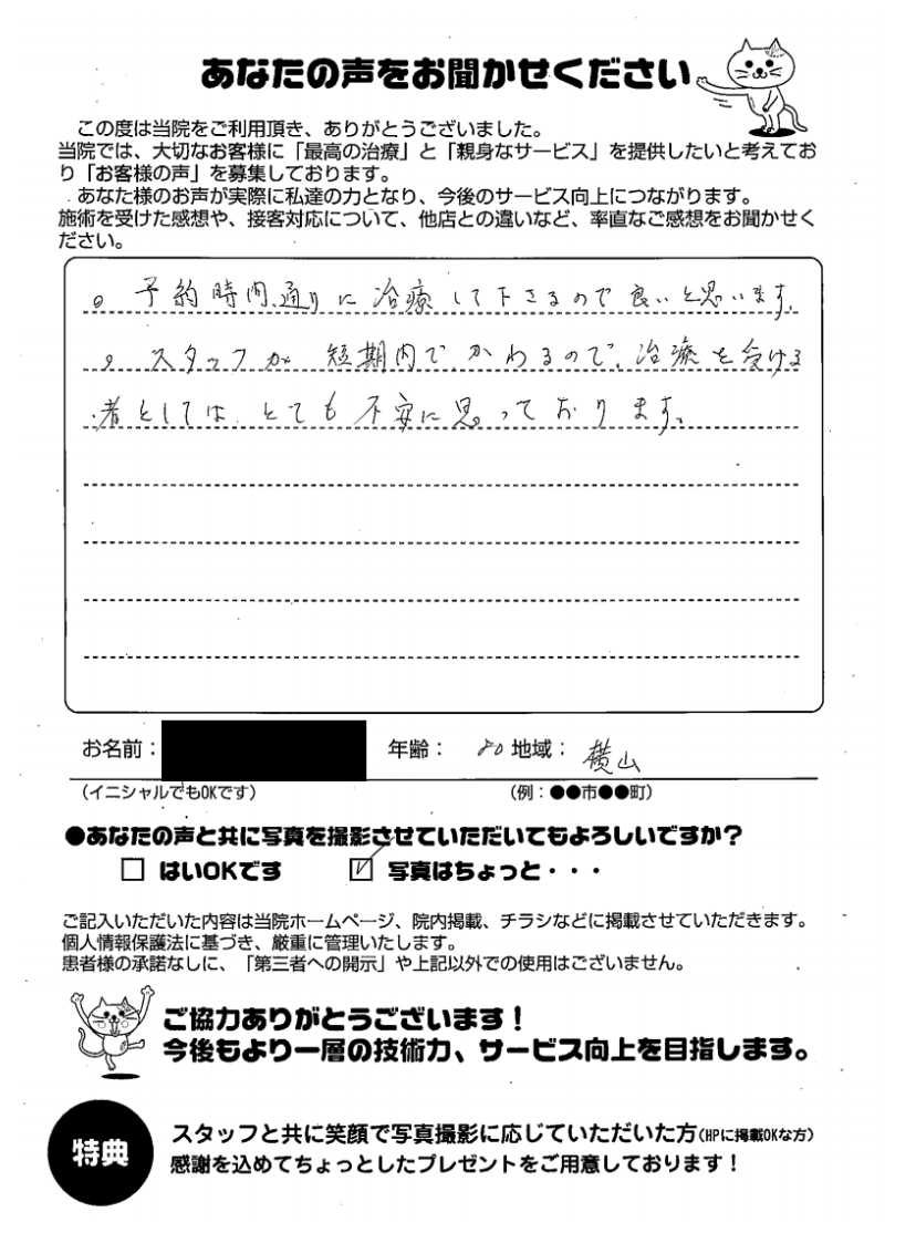 スタッフが短期間でかわるので、治療を受ける者としては不安に思っております。