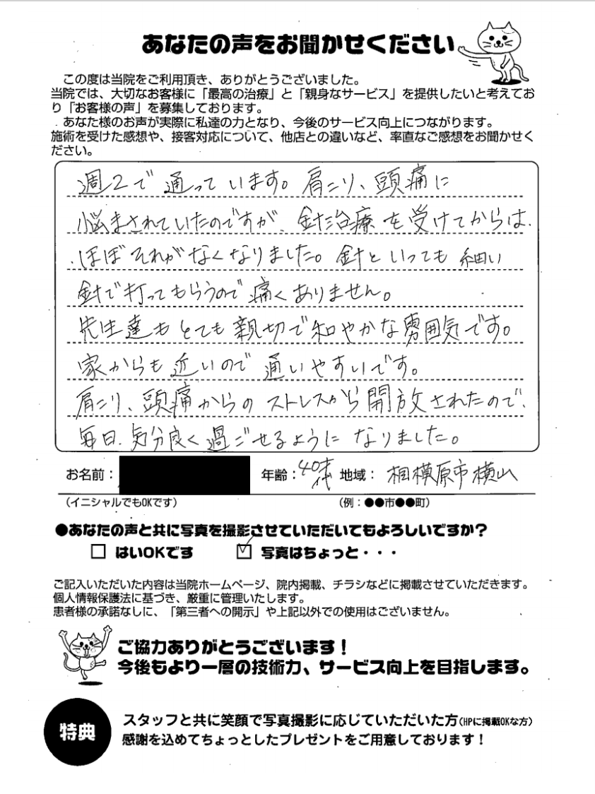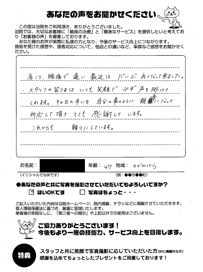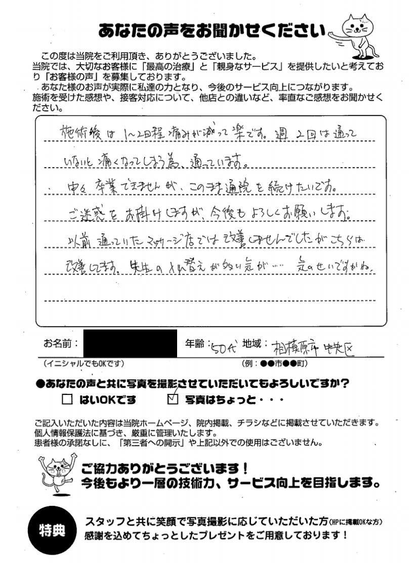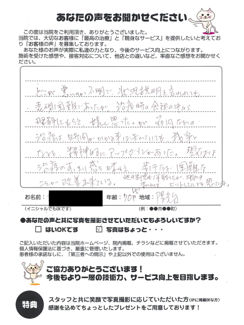前からものすごい具合が悪かったので、別の治療院・接骨院をあちこち行かせていただいたんですけど、ここまで私の痛みに寄り添って痛いところだけでなく痛みの原因になっている部分もしっかり施術してくれて、そこまでやってくれるところが今までなかったのでずっと通ってますね。