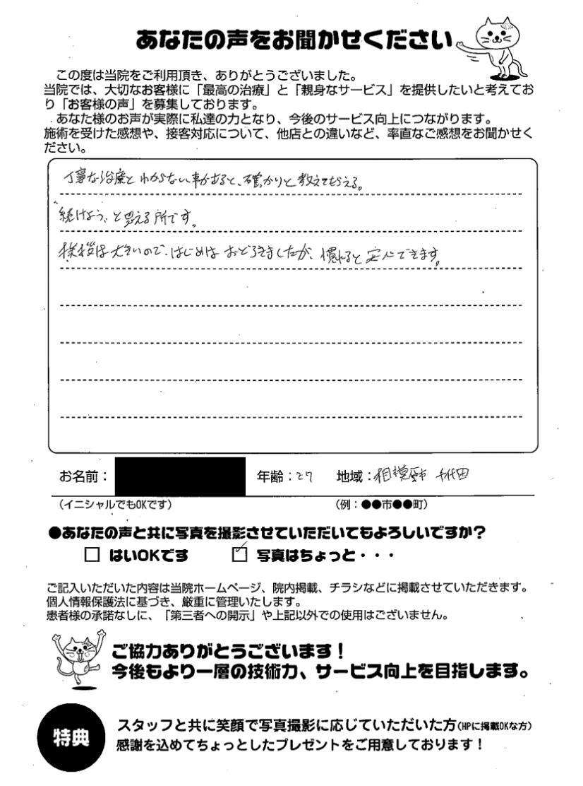 初めは腰痛が原因で通い始めましたが、猫背や骨盤が歪んでいることを教えてもらい、全体的な体の姿勢を治してもらい助かりました。