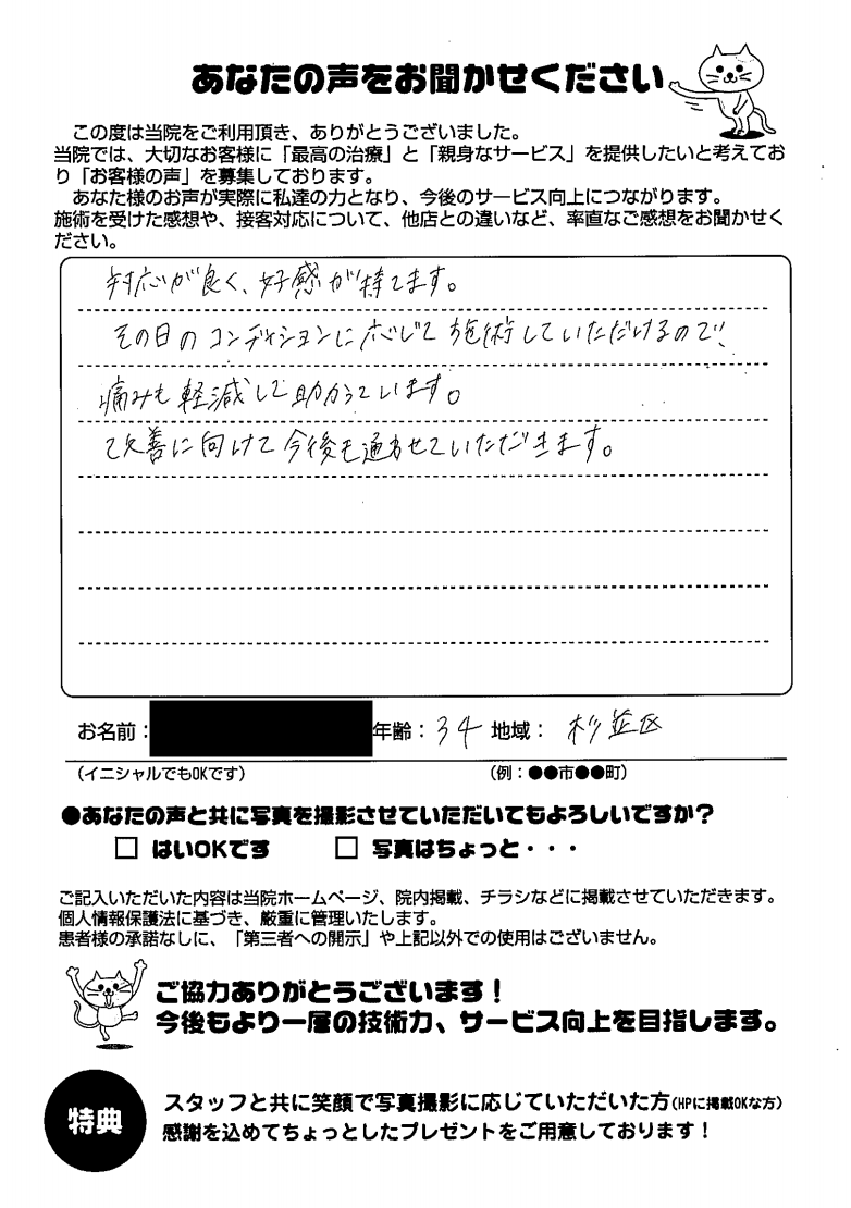 その日のコンディションに応じて施術をしていただけるので、痛みも軽減して助かっています。