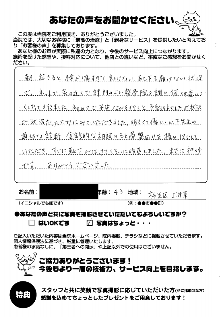明るくて優しい山下先生の適切な診断、金銭的な相談のもと、骨盤周りを揉みほぐしていただき、すぐに靴下がはけるくらいに改善しました。
