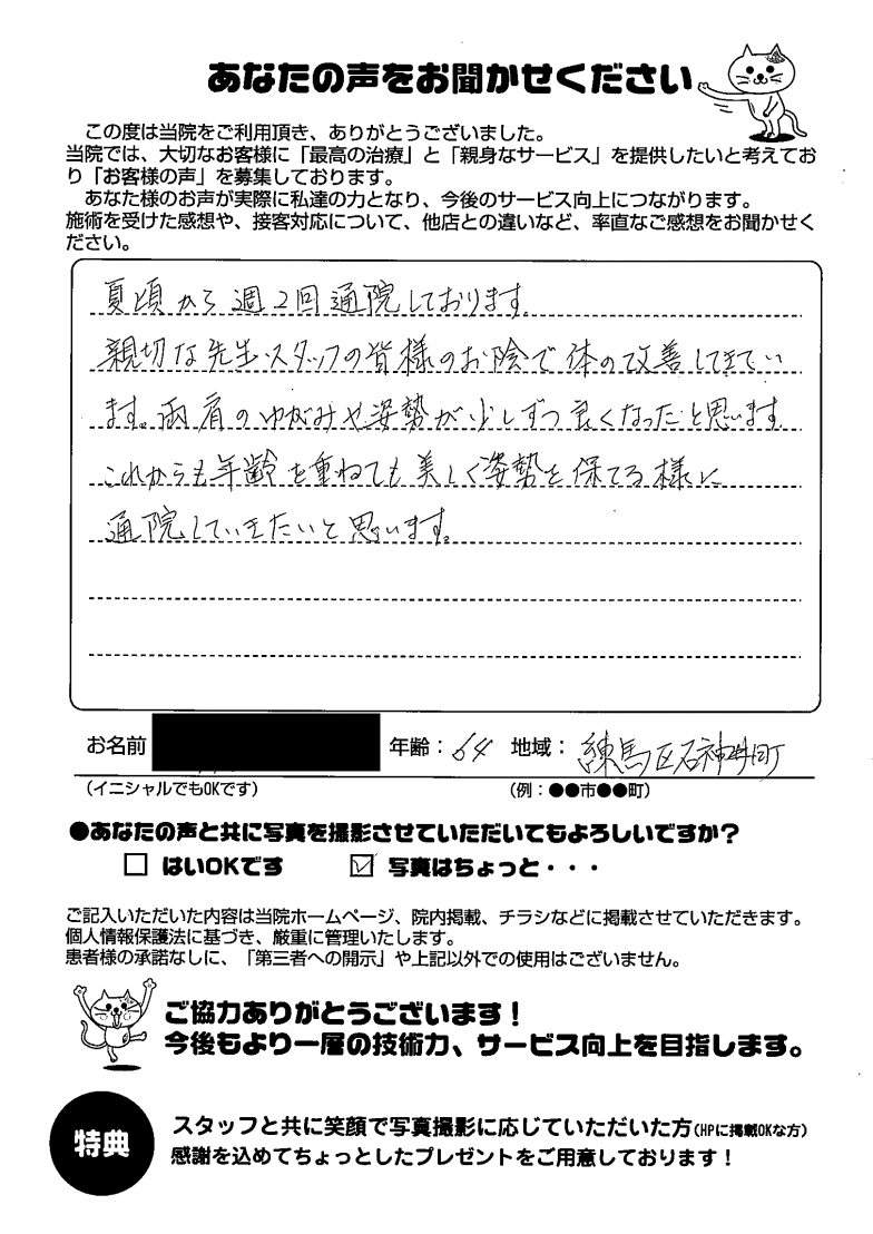 これからも年齢を重ねても美しく姿勢を保てる様に通院していきたいと思います。