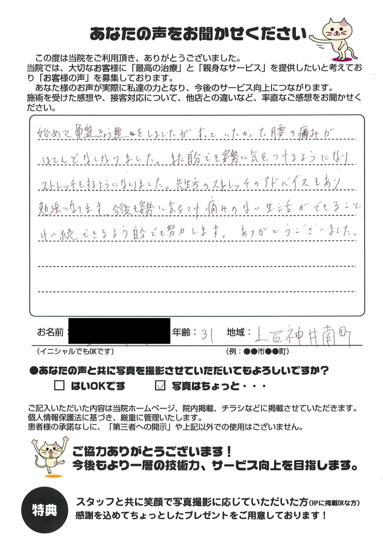 初めて骨盤矯正をしましたがずっと痛かった腰の痛みがほとんどなくなりました。