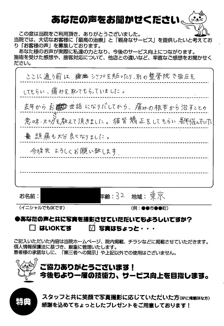 猫背矯正をしてもらい、長年悩んでいた頭痛もだいぶ良くなりました。