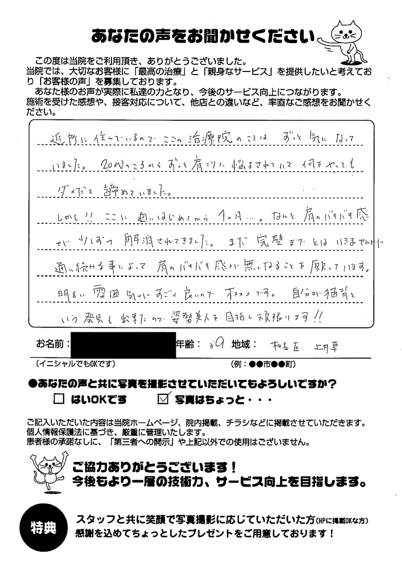 20代の頃からずっと肩こりに悩まされて何をやってもダメだと諦めていました。