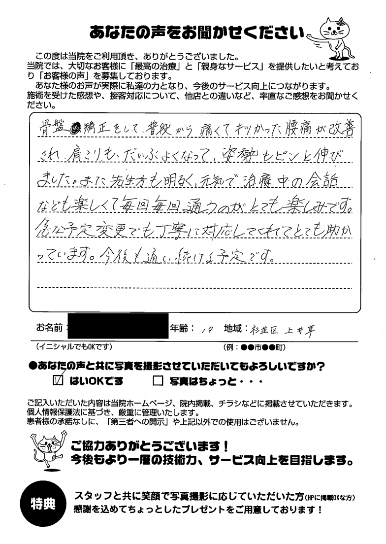 腰の痛みだけでなく、姿勢から改善していただき、本当に感謝しています。