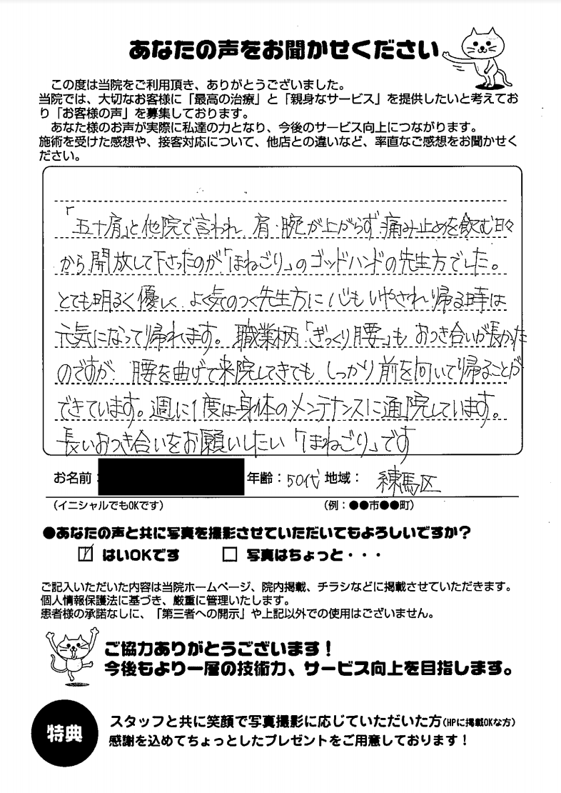 「五十肩」と他院で言われ、肩・腕が上がらず、痛み止めを飲む日々から開放して下さったのが「ほねごり」のゴッドハンドの先生方でした。
